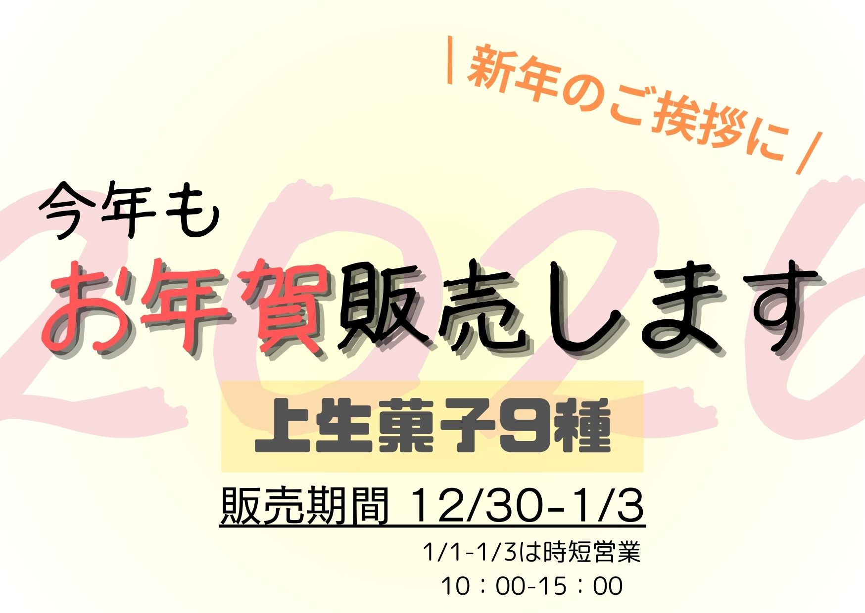 お年賀-上生菓子- 2026 1/04 季節の商品 特別な日に 準備中 新年のご挨拶の御供にぴったり 「2026年のお年賀販売します」 上生菓子セット 紅梅 (練り切り)280円 干支 (織部上用)270円 初春 (きんとん)280円 亀甲 (栗羊羹)270円 松 (きんとん)270円 竹 (練り切り)280円 鶴(羽二重 白餡)280円 花びら餅 (羽二重 味噌餡)350円 福梅270円 季節の商品 特別な日に 準備中 この記事が気に入ったら フォローしてね! Follow Me SNS投稿すると、ご購入時特典あり!シェアしてね URLをコピーする URLをコピーしました! 桜餅 うぐいす餅 木枯らし 雪椿 のし餅・まる餅 紅白饅頭 山土産(やまづと) 亀甲 紅白餅 栗羊羹